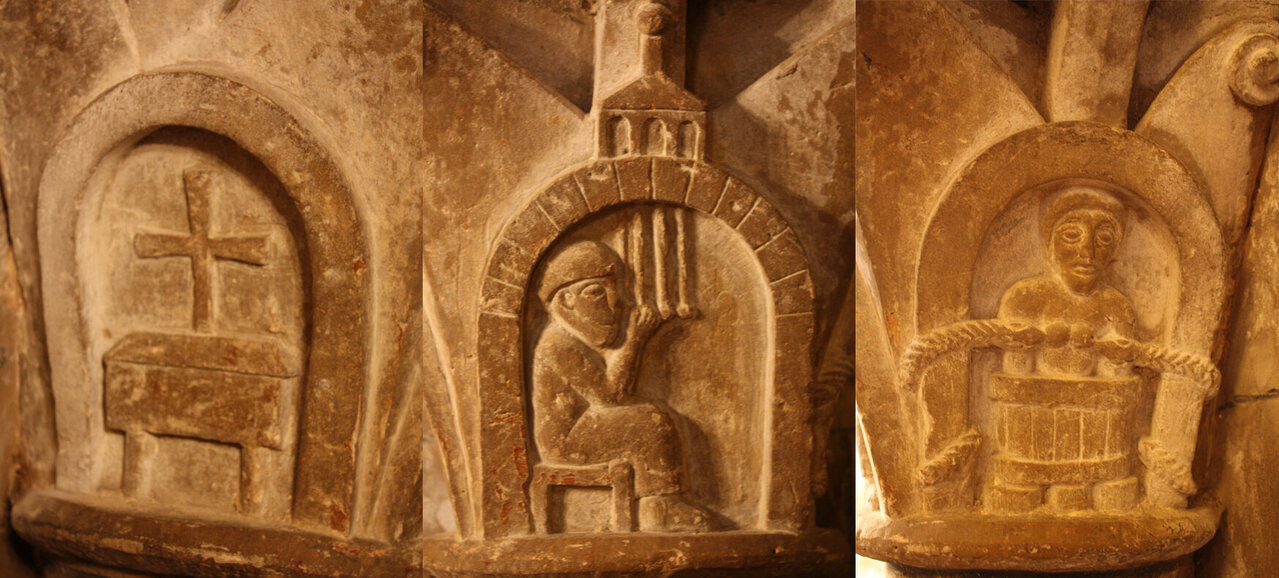 Into the lower part there are arcatures made by juxtaposed diamond-shaped stones resting on the capitals which have simple designs of leaves, interlacing stalks, floral designs, pinecones, lions, and eagles. One of these, however, seems very strange. It takes the form of three shapes: a sarcophagus, a bellringer and a woman how seem to be suckling two snakes.
